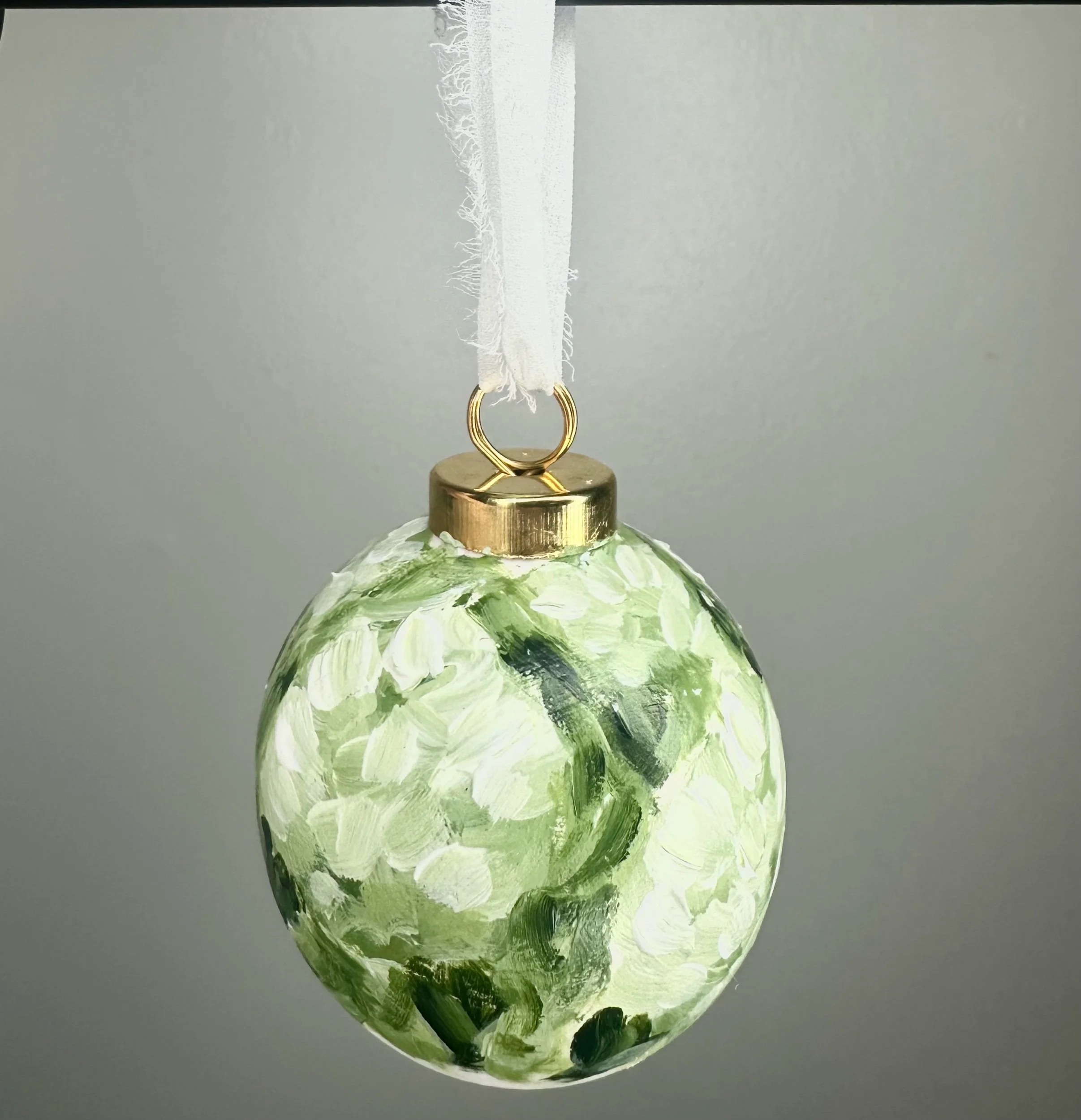 Hydrangeas painted on a 2.5 inch white ceramic ornament
